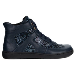 Dámské barefoot zimní kožené boty zateplené kožíškem Olivier 202MP černé a tmavě modré s květinami
