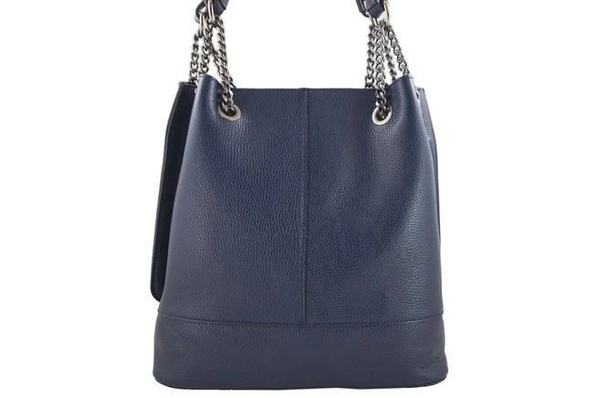 Vnitřek kabelky: semišová hlavní přihrádka tašky je rozdělena na polovinu velkou a prostornou kapsou na zip. Tato módní dámská kožená kabelka se zapíná na zip, má tmavé kovové kování, dvě ucha (z přírodní kůže a z řetízku) bez možnosti nastavení (délka 54 cm, výška 21 cm) a kovové nožičky na dně chránící před odřením.