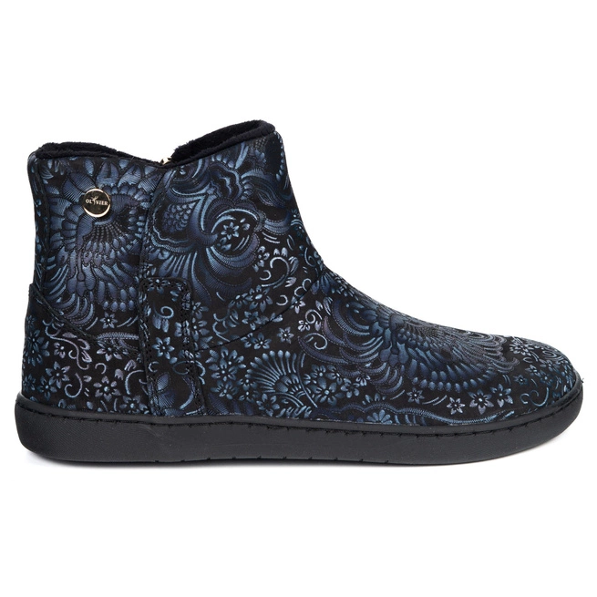 Dámské barefoot zimní kožené boty zateplené kožíškem Olivier 202MP černé a tmavě modré s květinami
