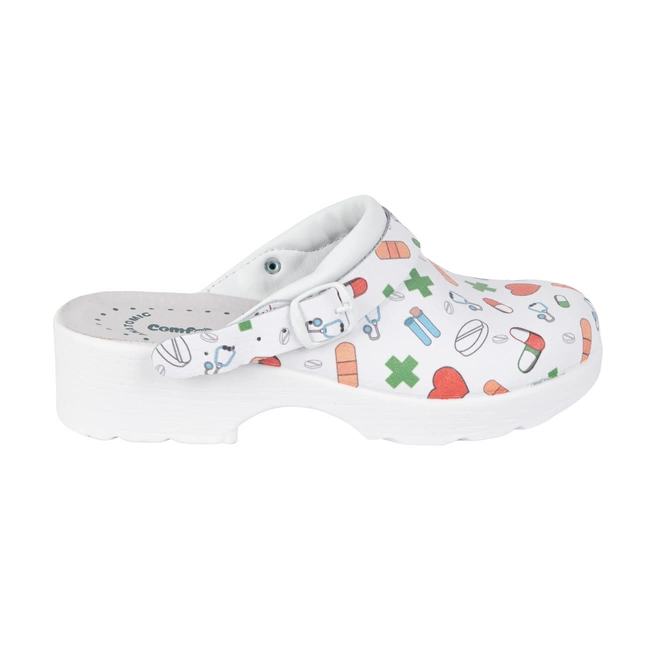 Model Comforty 3521 jsou lehké a funkční zdravotní žabky určené pro každodenní použití ve zdravotnictví, ordinacích, klinikách a kosmetických zařízeních. Díky anatomicky tvarované stélce a praktickému pásku, který lze nosit klasicky za patou nebo nasadit přes nárt, zajišťují žabky pohodlné nošení po mnoho hodin. Barevný potisk odkazující na lékařské motivy dodává modelu moderní nádech a odlišuje ho od klasických variant.