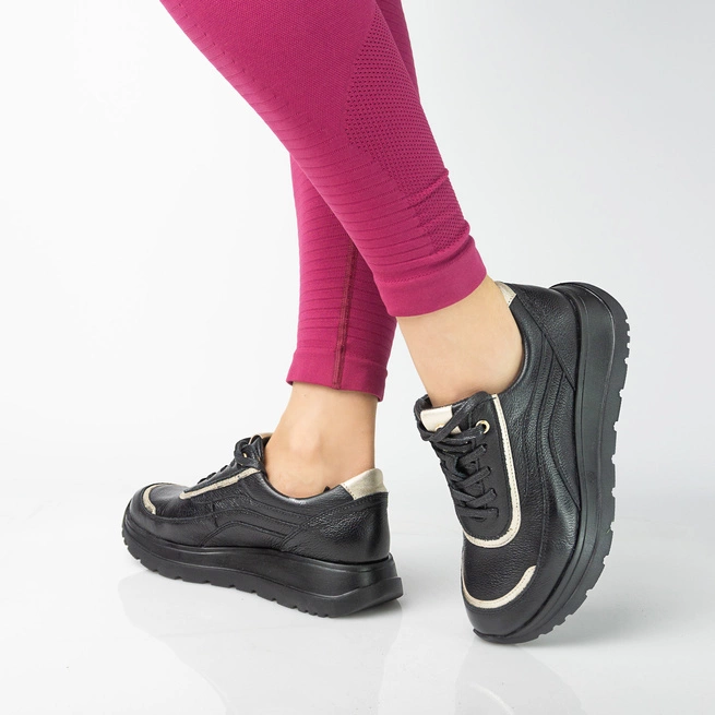4 cm vysoká platforma nejen opticky prodlužuje nohy, ale také podporuje přirozenou biomechaniku chodidla, což je velkou výhodou při každodenním pohybu. Klasická černá barva dělá z těchto polobotek univerzální kousek šatníku, který lze snadno kombinovat s různými styly - od klasických kalhot a košile až po elegantní šaty.