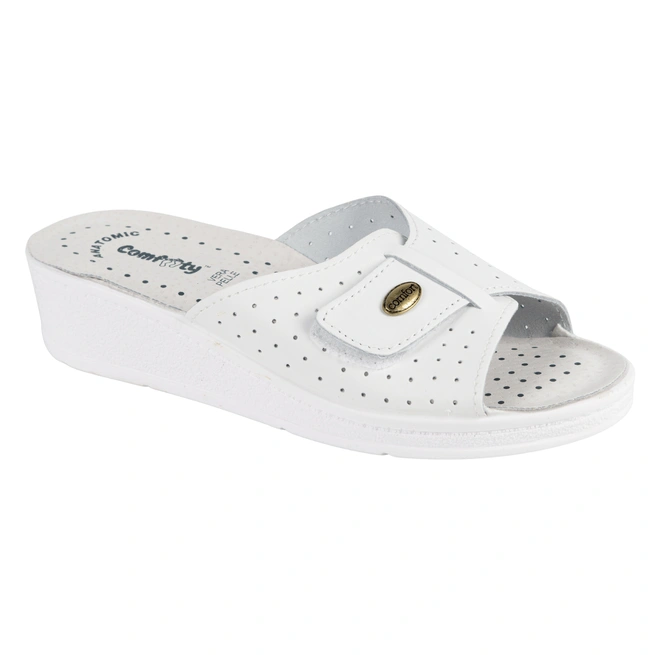 Model Comfooty NADIA jsou praktické dámské žabky určené pro každodenní použití v pracovním prostředí nebo doma. Jejich největší výhodou je dvojité nastavení pomocí popruhů s přezkou, která umožňuje dokonalé přizpůsobení individuálnímu tvaru chodidla. Svršek je vyroben ze snadno udržovatelného materiálu, který se dobře chová i při intenzivním používání.