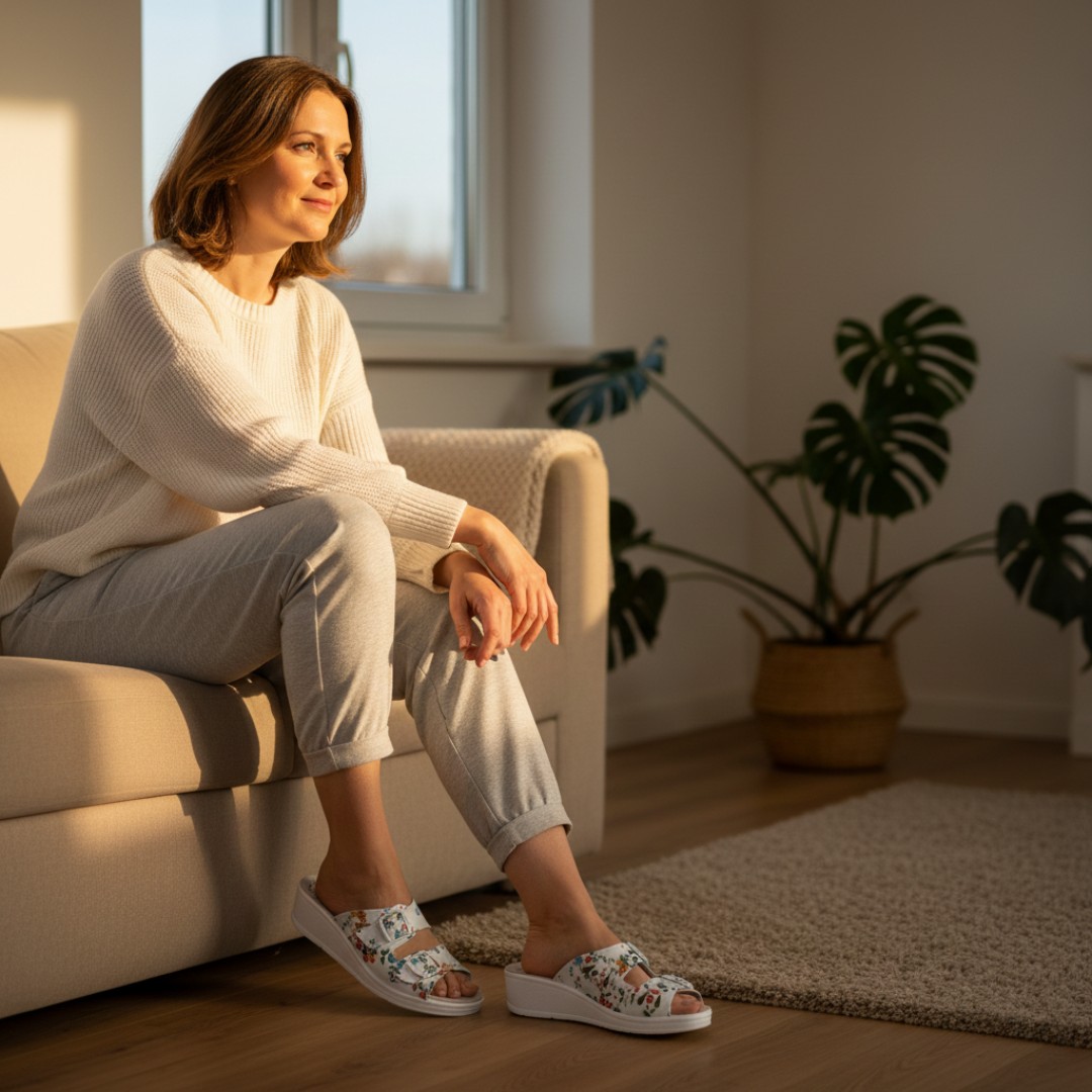 Vnitřek žabek je vybaven masážní stélka, který podporuje krevní oběh a poskytuje příjemný pocit při každém kroku. Díky lehké a stabilní podrážce a anatomickému profilování je model Comfooty NADIA vynikající volbou pro ženy, které si cení pohodlí, funkčnosti a jednoduchých, osvědčených řešení.
