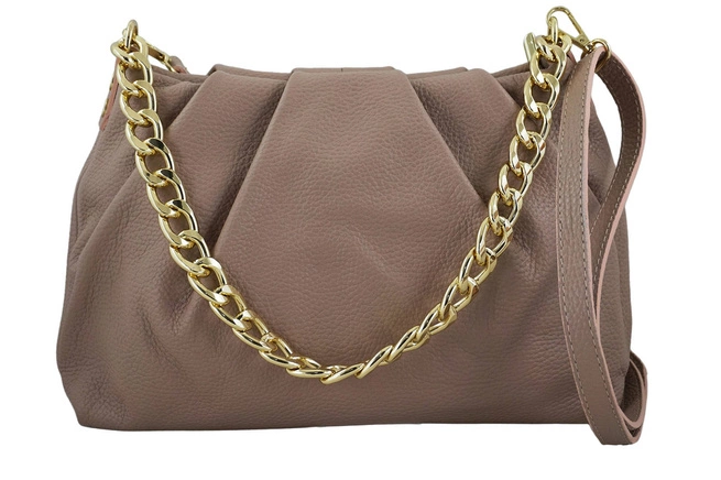 Kabelka s vlnitým řetízkem pudrově růžová barva je vyrobena z přírodní kůže. Elegantní styling doplní kabelky dostupné v našem obchodě - velký výběr barev, nejnovější trendy, zajímavé kombinace různých druhů přírodní kůže a jemné zdobení. Módní kabelka s nařaseným řetízkem v pudrově růžové barvě je dokonalým doplňkem šatníku - hodí se k šatům nebo elegantním kalhotám. Univerzální střih, ideální velikost pro nošení nezbytných věcí - telefonu, peněženky a drobných toaletních potřeb. Výrazný zlatý řetízek, řasení na obou stranách a kvalitní přírodní kůže jsou zárukou, že kabelka bude dokonalým doplňkem každého oblečení pro zvláštní příležitost. Chcete být informováni o nové kolekci, doplnění zásob nebo aktuálních akcích?? Přihlaste se k odběru našeho newsletteru - spolu s informacemi o nejnovější kolekci získáte slevu -15 % na nákup. Využijte nabídky našeho obchodu - zaručujeme vysokou kvalitu výrobků, solidní zpracování a velký výběr modelů kabelek a peněženek.