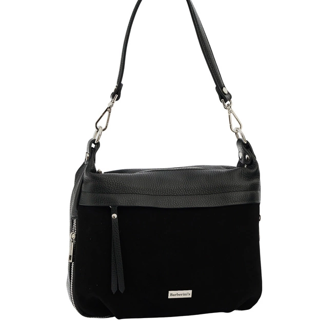 Kožená kabelka se semišovými akcenty v černé barvě - elegance a funkčnost v jednom. Objevte dokonalou kombinaci stylu, pohodlí a praktičnosti. Kožená kabelka se semišovým akcentem je model vytvořený pro ženy, které ocení klasiku v moderním vydání. Je vyrobena z vysoce kvalitní přírodní kůže, jejíž přední strana je z měkkého, na dotek příjemného semiše, a působí elegantně a nadčasově. Je ideální do práce, na schůzky i na každodenní nošení - praktický a zároveň elegantní. Elegantní a zároveň praktická kožená kabelka se semišovými akcenty je ideální pro každou situaci - do práce, na nákupy, na setkání s přáteli nebo na víkendový výlet. Skvěle se hodí jak ke klasickému kancelářskému stylu, tak k uvolněným ležérním soupravám.