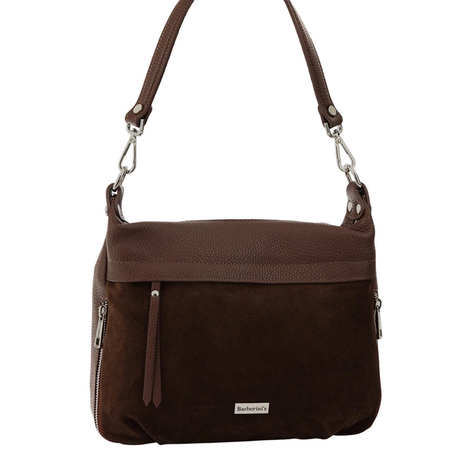 Vnitřek kabelky: praktická kožená kabelka se semišovými akcenty je zakončena podšívkou. Středová velká kapsa na zip našitá na dně rozděluje střed na dvě části, což usnadňuje udržování pořádku ve věcech. Uvnitř je také další malá kapsa na zip a přihrádka na telefon. Model se zapíná na zip a stříbrný kování dodává jemný, moderní nádech. Tato kožená kabelka se semišovými akcenty má dva připevnitelné popruhy - kratší držadlo pro nošení v ruce (délka. 50 cm, V. 29 cm, šířka rukojeti 2,8 cm) a delší nastavitelný popruh (maximální délka. 110 cm, maximální výška. 60 cm, šířka popruhu 1,8 cm), takže se dá pohodlně nosit na rameni nebo přes rameno. Taška je prostorná, s promyšleným uspořádáním kapes pro dokonalou organizaci nezbytných věcí. Na přední straně je velká semišová kapsa na zip zdobená jemným koženým řemínkem. Na zadní straně je menší praktická kapsa na zip, ideální na klíče nebo doklady. Kromě toho jsou na bocích dvě malé kapsy na zip, které se skvěle hodí k diskrétnímu uložení.