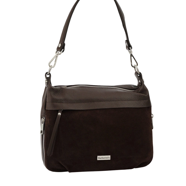 Kožená kabelka se semišovými akcenty v tmavě hnědé barvě - elegance a funkčnost v jednom. Objevte dokonalou kombinaci stylu, pohodlí a praktičnosti. Kožená kabelka se semišovým akcentem je model vytvořený pro ženy, které ocení klasiku v moderním vydání. Je vyrobena z vysoce kvalitní přírodní kůže, jejíž přední strana je z měkkého, na dotek příjemného semiše, a působí elegantně a nadčasově. Je ideální do práce, na schůzky i na každodenní nošení - praktický a zároveň elegantní. Elegantní a zároveň praktická kožená kabelka se semišovými akcenty je ideální pro každou situaci - do práce, na nákupy, na setkání s přáteli nebo na víkendový výlet. Skvěle se hodí jak ke klasickému kancelářskému stylu, tak k uvolněným ležérním soupravám.