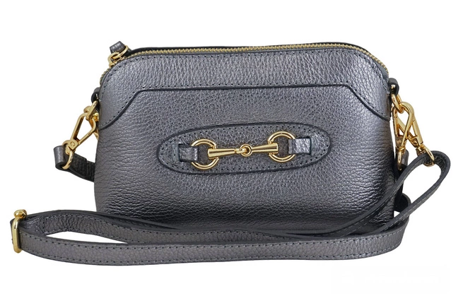 Mała torebka wieczorowa skórzana w kolorze srebrnym ciemnym została wykonana ze skóry naturalnej licowej. Klasyczny fason urozmaicony złotymi ozdobami mocowanymi na doszytym elemencie skórzanym, z przodu torebki oraz modna metalizowana skóra naturalna wyróżnia ten model listonoszki, która podkreśli stylizacje na wyjątkowe okazje. Dzięki klasycznemu i stonowanemu wzornictwu, niewielka błyszcząca torebka wyróżni Twój styl na każdej uroczystości lub spotkaniu ze znajomymi.