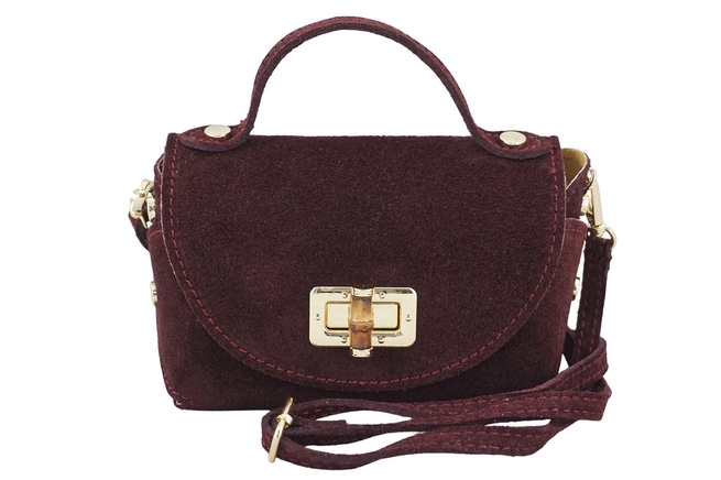 Malá semišová společenská kabelka s ozdobnou sponou - Barberinis. Je vyroben z přírodní semišové kůže a potěší svým měkkým omakem a jedinečnou strukturou materiálu. Jeho tmavě vínový odstín je ideální pro denní i večerní vycházky, kdy chcete svému vzhledu dodat sofistikovanost. Dekorativní bambusová spona na klopě je poutavým detailem, který dodává kabelce jedinečný půvab, zatímco jemné zlaté prvky podtrhují elegantní charakter modelu. Elegance, styl a nadčasová kvalita - malá semišová společenská kabelka je ideální volbou pro ženy, které si cení kvality, pohodlí a módního minimalismu s nádechem luxusu.