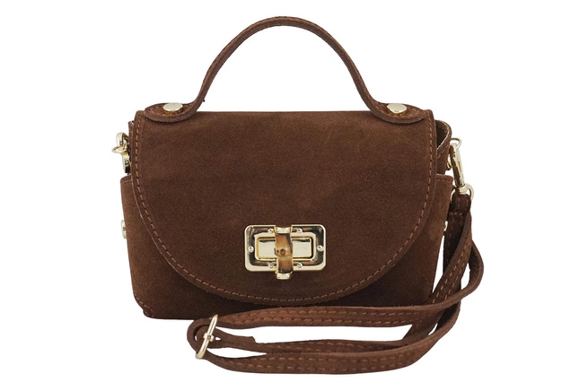 Malá semišová společenská kabelka s ozdobnou sponou - Barberinis. Je vyroben z přírodní semišové kůže a potěší svým měkkým omakem a jedinečnou strukturou materiálu. Jeho tmavý, teplý hnědý odstín je ideální pro denní i večerní vycházky, kdy chcete svému vzhledu dodat sofistikovanost. Dekorativní bambusová spona na klopě je poutavým detailem, který dodává kabelce jedinečný půvab, zatímco jemné zlaté prvky podtrhují elegantní charakter modelu. Elegance, styl a nadčasová kvalita - malá semišová společenská kabelka je ideální volbou pro ženy, které si cení kvality, pohodlí a módního minimalismu s nádechem luxusu.