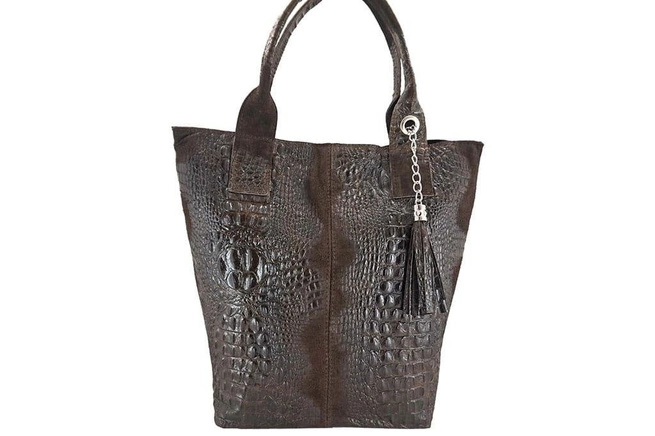 Módní kožená taška - CROCO byla vyrobena v Itálii, z přírodní semišové kůže. Nabídka internetového obchodu - kabelka, která doplní ležérní styling. Měkká semišová kůže, pohodlná délka rukojeti, módní střapec a zvířecí motiv - to vše zaručuje, že váš styl bude jedinečný. Módní kožená nákupní taška formátu A4 s pohodlnou délkou ucha se skvěle hodí k běžnému pracovnímu i univerzitnímu oblečení.