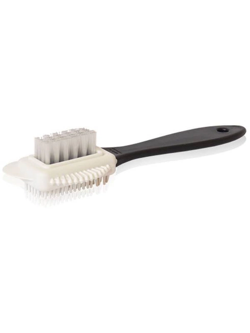 Kartáč určený k čištění nubukové obuvi. Gumové štětiny čistí zaschlé nečistoty na botě, nylonové štětiny osvěžují vzhled kůže. Boční žebra umožňují čištění švů a okrajů.