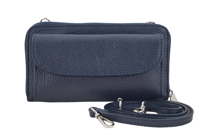Peněženka s koženým pouzdrem na telefon tmavě modrá je také mini kabelka po připevnění dlouhého a nastavitelného popruhu. Ideální pro jakýkoli styling, nezbytný doplněk vašeho každodenního šatníku. Díky malým rozměrům se vám pouzdro vejde do kabelky nebo ho můžete pohodlně nosit přes rameno. Peněženka s pouzdrem na telefon z lícové kůže je volbou pro ženy, které hledají módní kožené doplňky.