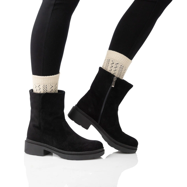 Jsou vyrobeny z vysoce kvalitní velurové kůže, která jim dodává elegantní vzhled a odolnost. Podrážka o tloušťce 4,5 cm poskytuje dostatečné odpružení a pohodlí při chůzi. Podrážka je vyrobena z vysoce kvalitního plastu, který je odolný proti oděru. Vnitřek bot je zateplený měkkým fleecem, takže jsou ideální pro chladnější dny a poskytují teplo a pohodlí. Zapínání na zip usnadňuje a urychluje obouvání a vyzouvání bot. Díky černé barvě jsou boty univerzální a hodí se k mnoha outfitům. Dámské kozačky Pollonus 5-1537-001 jsou vynikající volbou pro ženy, které hledají elegantní, pohodlnou a teplou obuv na podzim a zimuZnačka