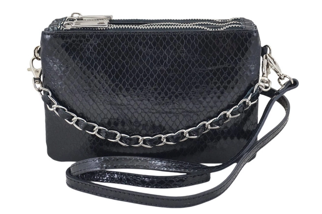 Večerní kabelka z lakované kůže v černé barvě je vyroben z pravé kůže. V kolekci vkusného a jedinečného koženého zboží najdete pošťácké tašky, které vás potěší svou ideální velikostí - tvarovaná forma nezastíní vaši siluetu, ale bude praktickým a stylovým doplňkem vašeho outfitu. Kožená lakovaná večerní taška v praktické černé barvě má zajímavý design a jemně se třpytí, upoutá pozornost.