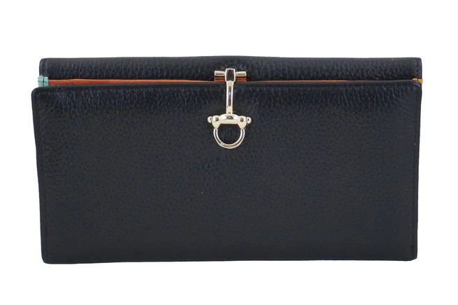 Vnitřek peněženky: ozdobné zapínání s dvanácti přihrádkami na karty a ažurovou kapsou na fotografie. Pod kartami jsou na obou stranách čtyři kapsy na doklady, vstupenky a vizitky a přihrádka na bankovky. Prostorná kapsa na mince s patentkou. Velká peněženka se zlatým zapínáním a barevným interiérem bude mít ideální velikost pro klasické kabelky, batohy, tašky nebo větší poštovní kufříky a může být i samostatným elegantním stylovým doplňkem.