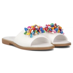 Modne skórzane klapki damskie DK6233 białe z kolorowymi kamykami