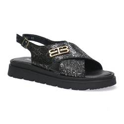 Skórzane klapki damskie na koturnie ażurowe Pollonus szary brokat/zloty5-1264-013