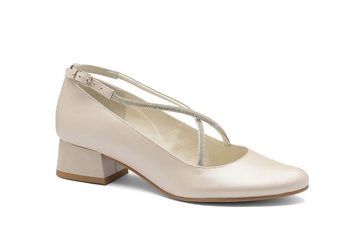 Czółenka ślubne skóra niskie z ozdobnymi paseczkami na krzyż ekru BUTDAM
