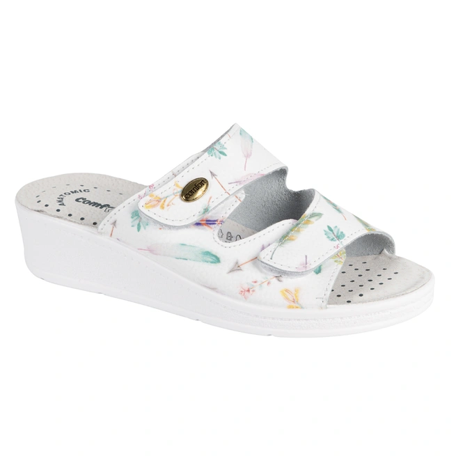 Damskie klapki skórzane na podwyższeniu, ozdobione subtelnym motywem piórek, to model stworzony z myślą o codziennym komforcie i lekkiej, kobiecej estetyce. Cholewka z naturalnej skóry została wyposażona w dwa regulowane paski, które umożliwiają dopasowanie obuwia do indywidualnych potrzeb stopy. Otwarta konstrukcja oraz perforowana wkładka sprzyjają przewiewności, dzięki czemu klapki dobrze sprawdzają się podczas dłuższego użytkowania w domu czy pracy.
