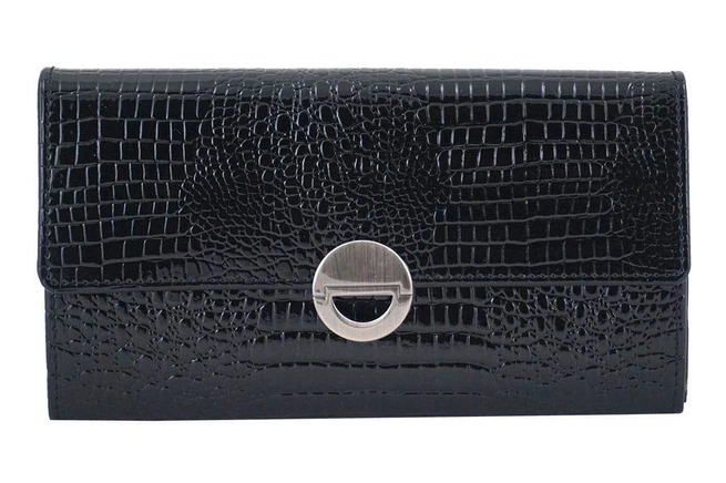 Wnętrze portfela: portfel ze skóry lakierowanej posiada zasuwaną kieszeń na monety, sześć miejsc na karty płatnicze, karty lojalnościowe oraz przegrody na banknoty. Portfel ze skóry lakierowanej posiada również otwartą kieszeń zewnętrzną.