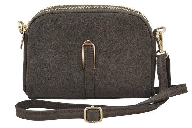 Wnętrze torebki: dwukomorowe wnętrze jest wykończone podszewką. W jednej z komór znajduje się mała zasuwana kieszonka. Mała torebka zamszowa wieczorowa jest zasuwana, posiada złote okucia oraz dopinany pasek z regulacją (maksymalna dł. 130cm, maksymalna wys. 62cm, szerokość paska 1,5cm). Dzięki regulowanemu paskowi torebka może być noszona wygodnie na skos lub na ramieniu, co zapewnia swobodę ruchów i komfort. Wygodne dzielone wnętrze umożliwia utrzymanie porządku - wszystkie niezbędne kobiece drobiazgi będą na swoim miejscu. Jej kompaktowy rozmiar sprawia, że jest idealna na co dzień – pomieści najważniejsze drobiazgi, takie jak telefon, portfel czy klucze, nie obciążając przy tym ramienia.