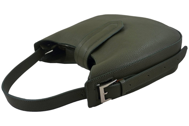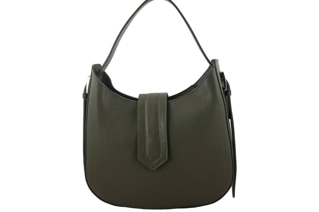 Wnętrze torebki:jednokomorowe i pojemne wnętrze jest wykończone podszewką. Wewnątrz znajduje się mała zasuwana kieszonka mieszcząca kosmetyki oraz dwie kieszenie otwarte, w których mieści się telefon, portfel oraz klucze. Stylowa i modna torebka skórzana jest zasuwana oraz dodatkowo zapinana na zatrzask magnetyczny mocowany na ozdobnym szerokim pasku przechodzącym przez środek torebki, posiada srebrne okucia oraz szeroki uchwyt z sześciostopniową regulacją (maksymalna dł. 83cm, maksymalna wys. 45cm) mocowany na dwóch srebrnych klamrach.