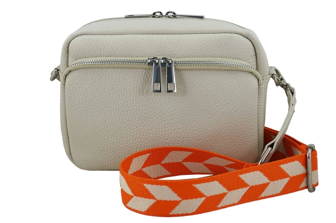 Torebka damska z ozdobnym i dopinanym kolorowym paskiem z regulacją (maksymalna dł. 126cm, maksymalna wys. 61cm, szerokość paska 3,7cm) posiada srebrne okucia.