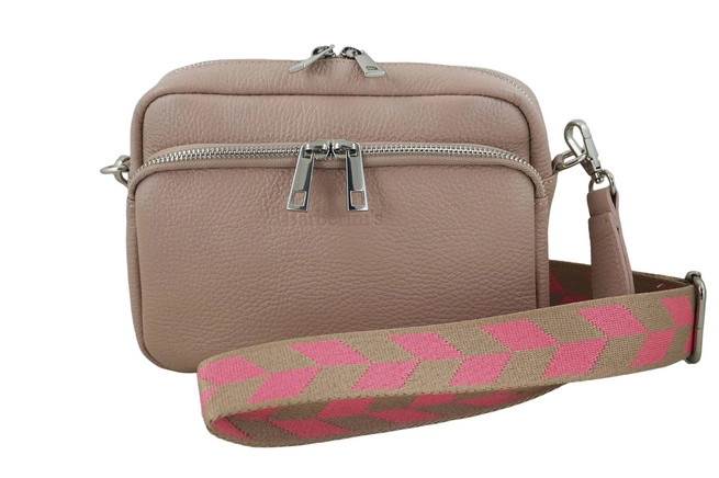 Torebka damska z ozdobnym i dopinanym kolorowym paskiem z regulacją (maksymalna dł. 126cm, maksymalna wys. 61cm, szerokość paska 3,7cm) posiada srebrne okucia.