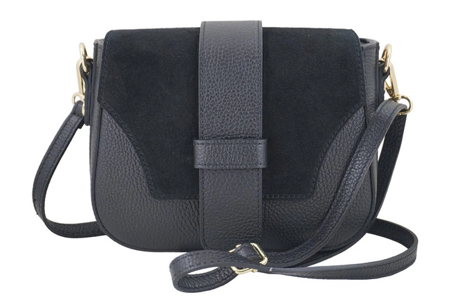 Wnętrze torebki: klasyczna torebka listonoszka z zamszową klapą jest jednokomorowa, wykończona podszewką. Wewnątrz wyodrębniono małą zasuwaną kieszonkę. Wyróżniający ten model szeroki pasek przechodzący przez środek klapki oraz zamszowa skóra dopasowana do skóry licowej, powoduje iż Twój outfit będzie stylowy i nowoczesny. Dostępna w najnowszej ofercie torebka listonoszka z zamszową klapą jest zasuwana i dodatkowo zapinana na magnes, posiada złote okucia, wygodnej długości dopinany pasek z regulacją (maksymalna dł. 120cm, maksymalna wys. 58cm, szerokość paska 1,3cm).
