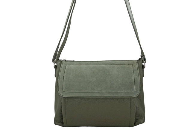 Torebka skórzana z zamszową klapką w kolorze zielonym jest wykonana ze skóry naturalnej licowej, w połączeniu ze skórą naturalną zamszową. Idealna propozycja wśród torebek na każdy dzień - duża ilość kieszeni powoduje, iż wszystkie niezbędne rzeczy do pracy będą na swoim miejscu, a szeroki i regulowany pasek umożliwia dostosowanie długości do noszenia torebki na ramieniu lub wygodnie przewieszonej przez ramię. Oferowane w najnowszej kolekcji torebki zaprojektowano tak, aby mieściły dokumenty, notatki, organizer lub notebook. Torebka skórzana z zamszową klapką to propozycja dla Pań ceniących gustowne dodatki codziennej garderoby, zwracających uwagę na jakość i estetykę wykonania produktu ze skóry naturalnej.